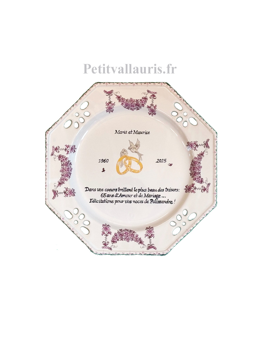 Grande assiette de Mariage modèle octogonale personnalisée décor fleurs tradition rose + Poème noces de Palissandre