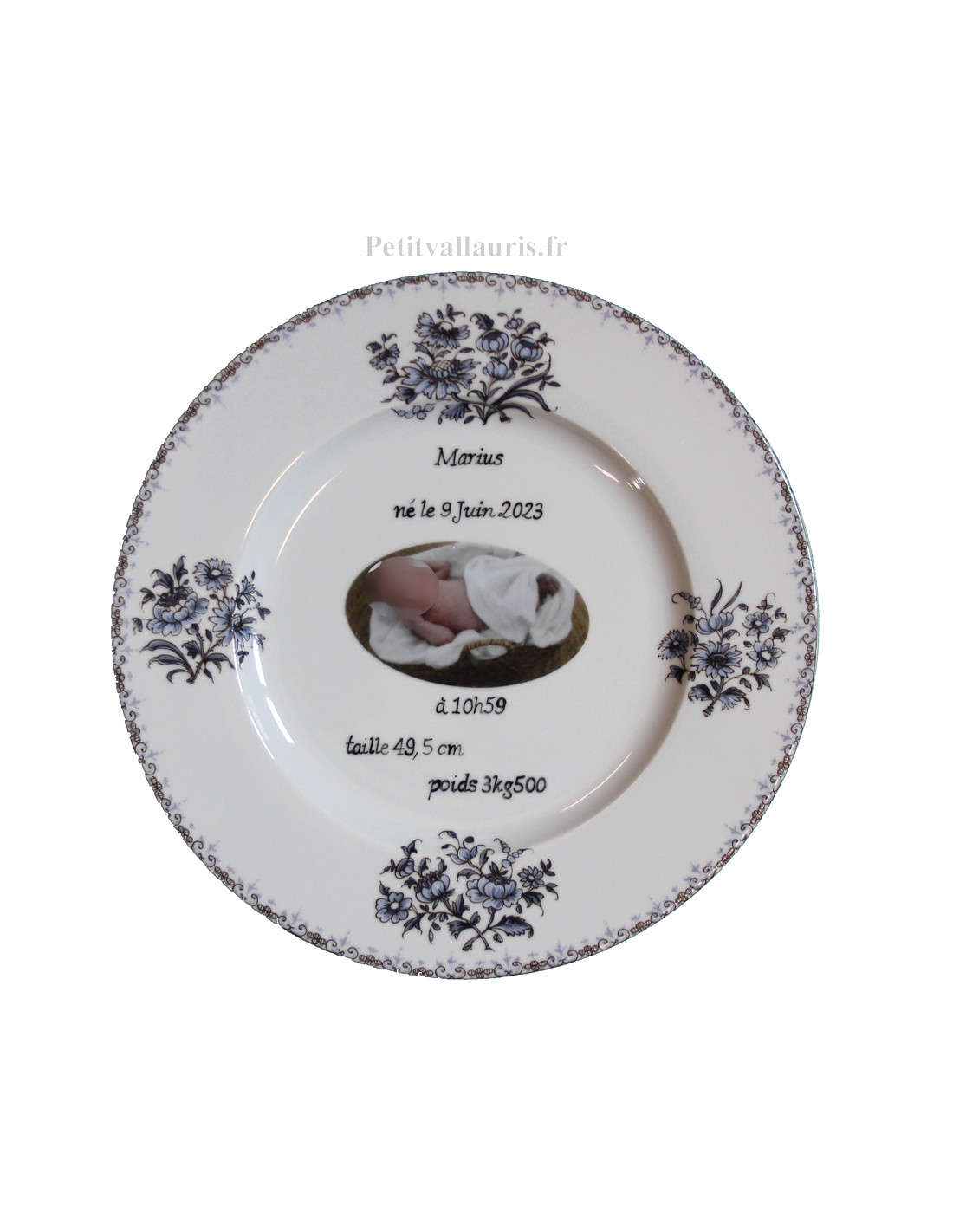 Assiette en porcelaine pour anniversaire avec photo et texte personnalisé décor fleurs bleues