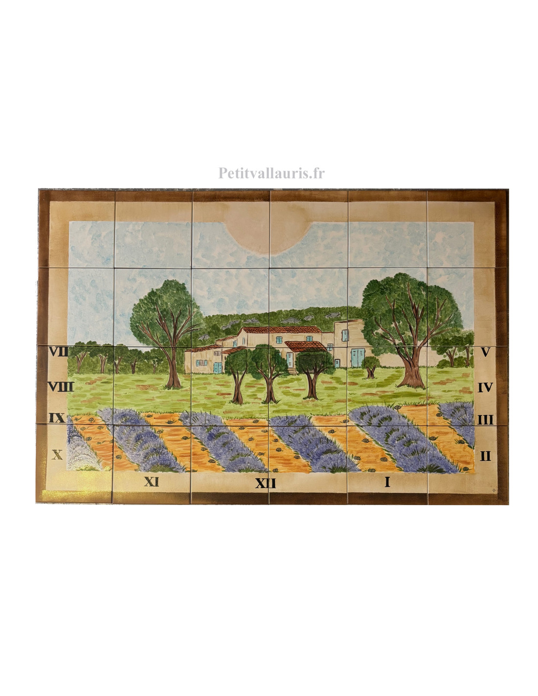 Cadran solaire décoratif sur carreaux en grès 20x20 cm d'après photo avec rajout champs de lavande, contour des carreaux en tons de beige et marron, chiffres Romain.