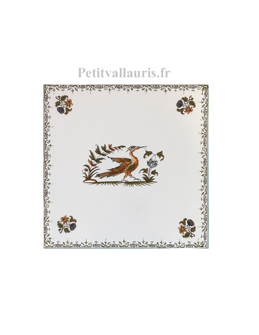 Carreau 20 x20 en faience blanche décor fleurs médium et motif central oiseau (2216) décor polychrome