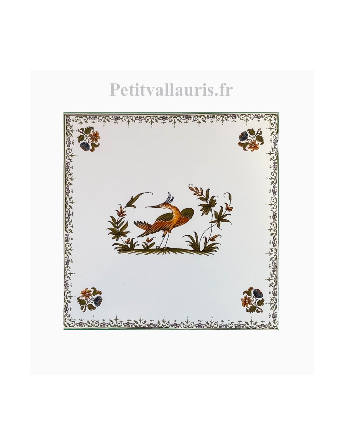Carreau 20 x20 en faience blanche décor fleurs médium et motif central oiseau tête retournée décor polychrome
