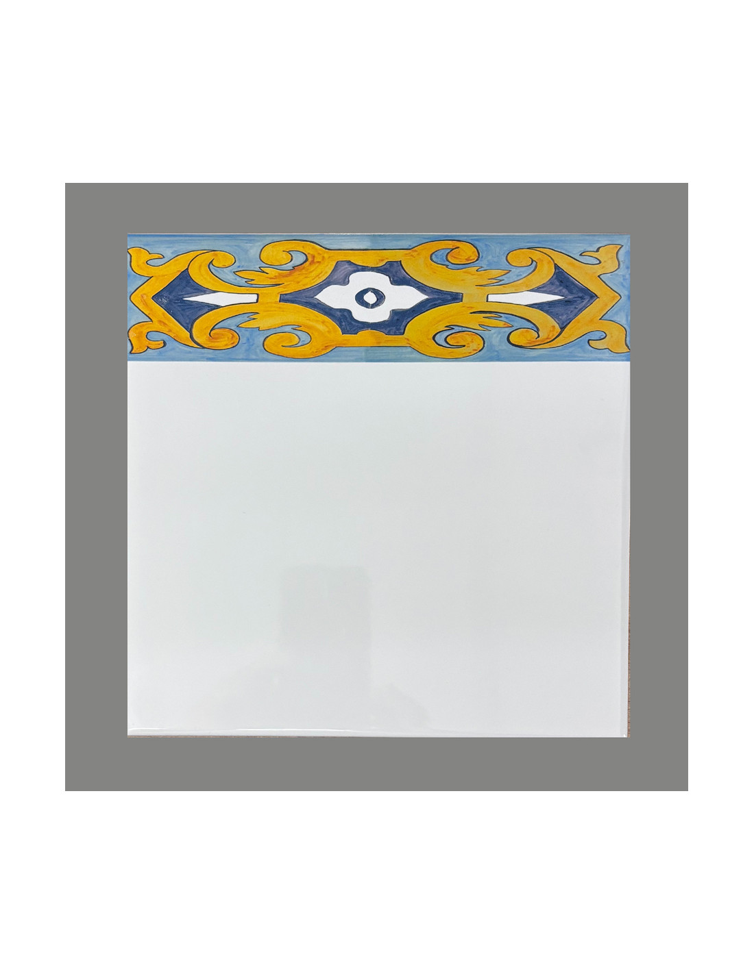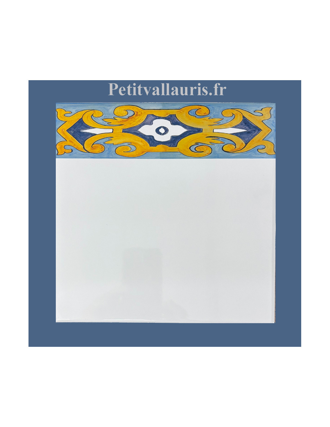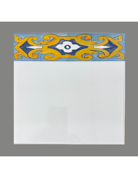 Carreau en faïence murale blanche avec motif arabesque turquoise, bleue et jaune.