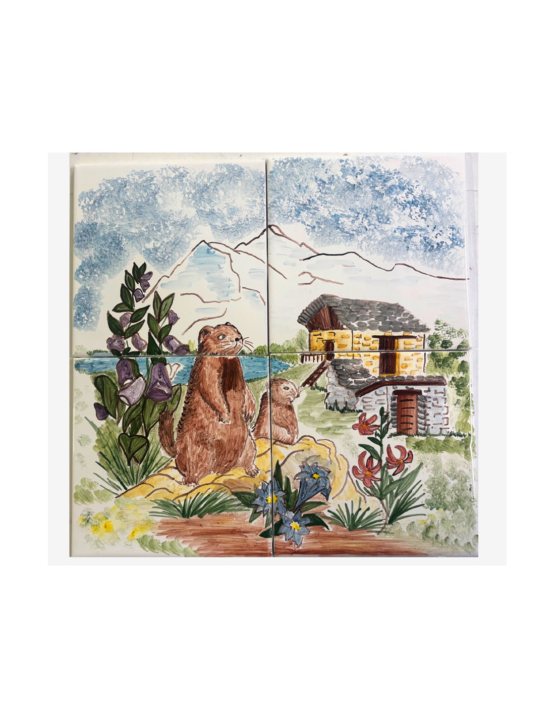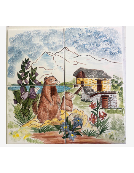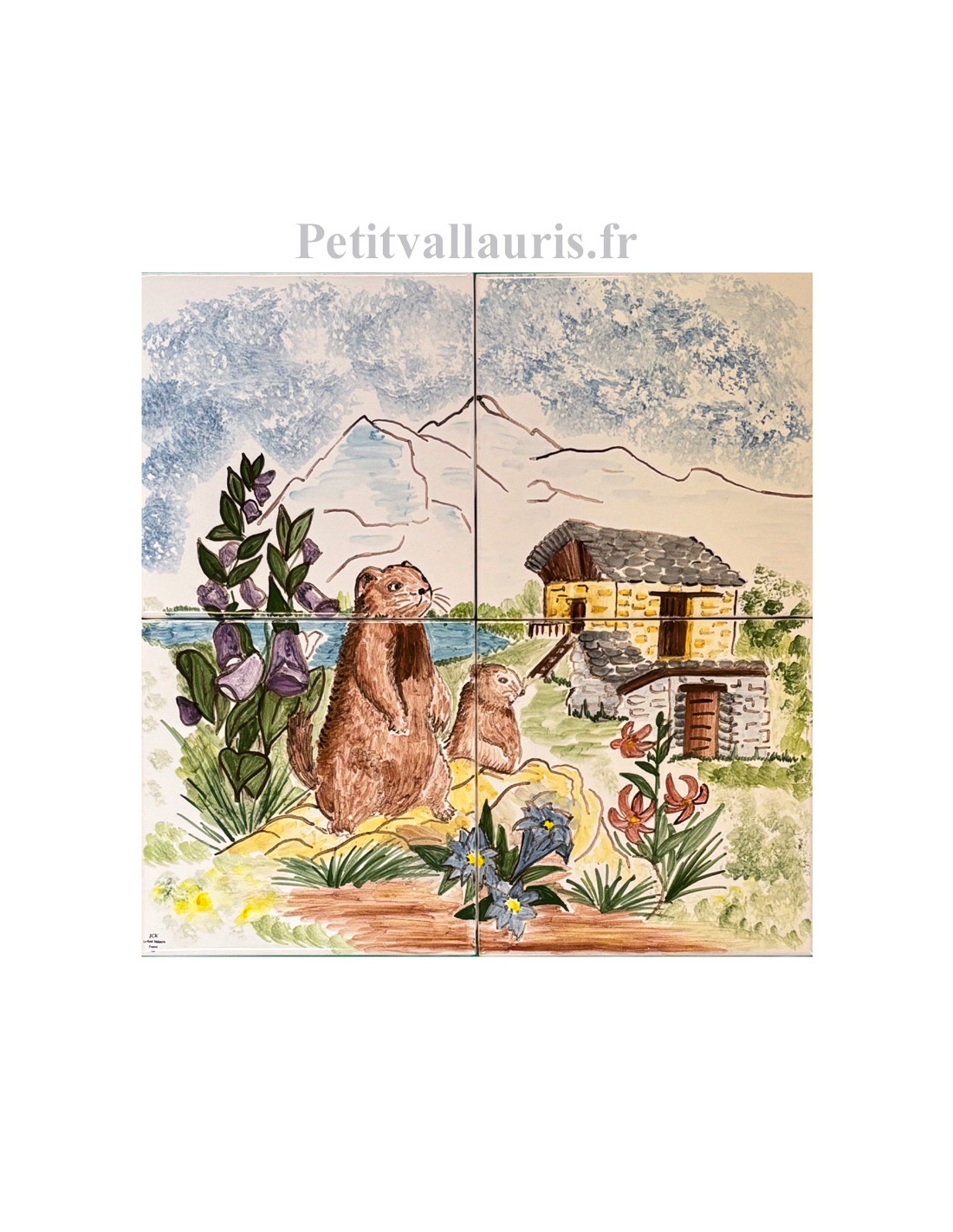 Fresque carrelage mural de faïence de 15x15 cm motif les marmottes dans un paysage de montagne en été , Fresque modulable sur d'autres formats de carreaux (10x10 et 20x20) et de grandeur du décor.
