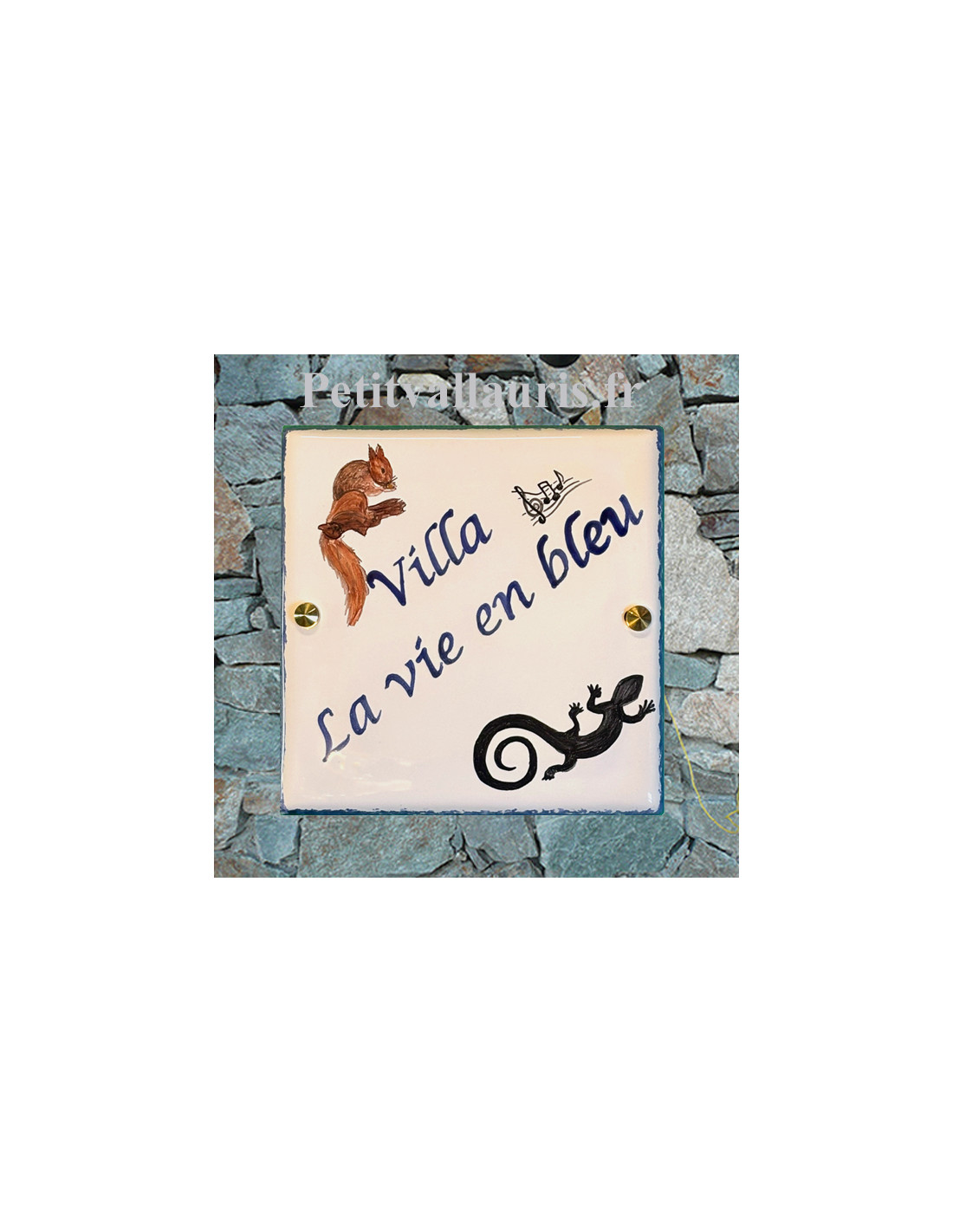 N'oubliez pas de sauvegarder votre personnalisation pour pouvoir l'ajouter au panierPlaque de villa au texte entièrement personnalisé avec motif artisanal l'écureuil et la Salamandre noire.