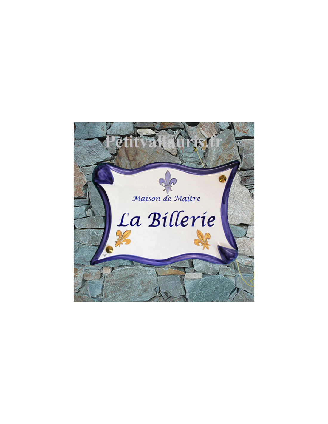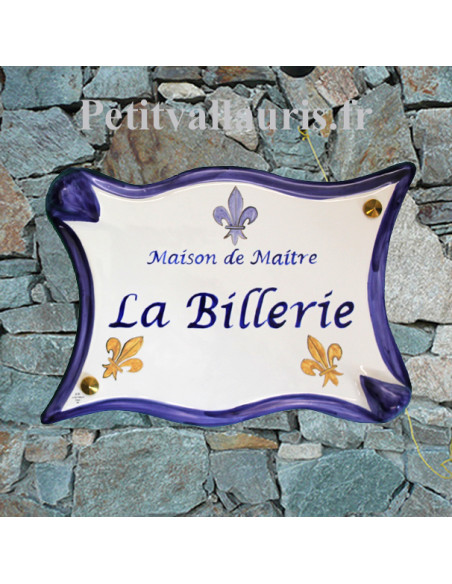 Grande plaque de maison modèle parchemin en céramique motif fleurs de lys + personnalisation