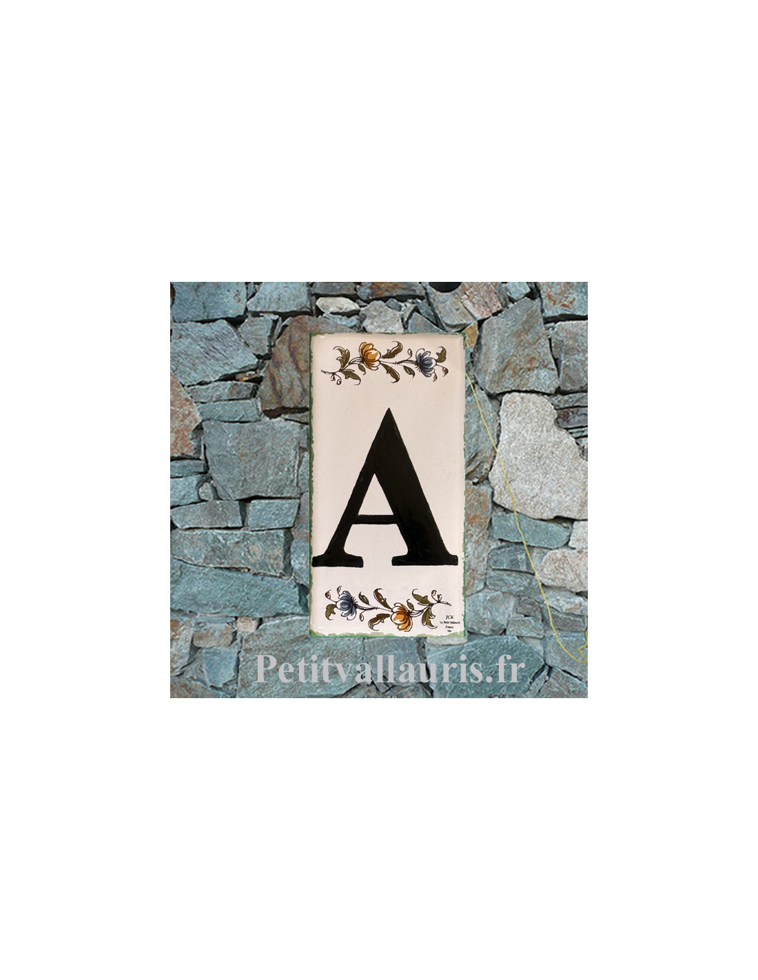 Lettre sur plaque au détail en faience motif fleurs tradition polychrome