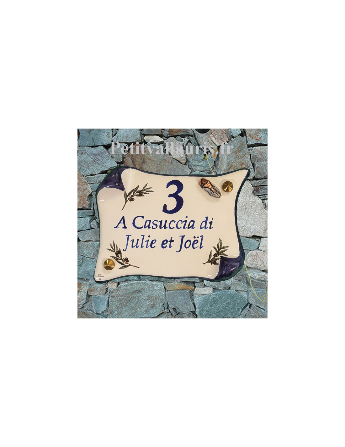 Plaque de Maison en faience modèle parchemin motif olives rouges + inscription personnalisée