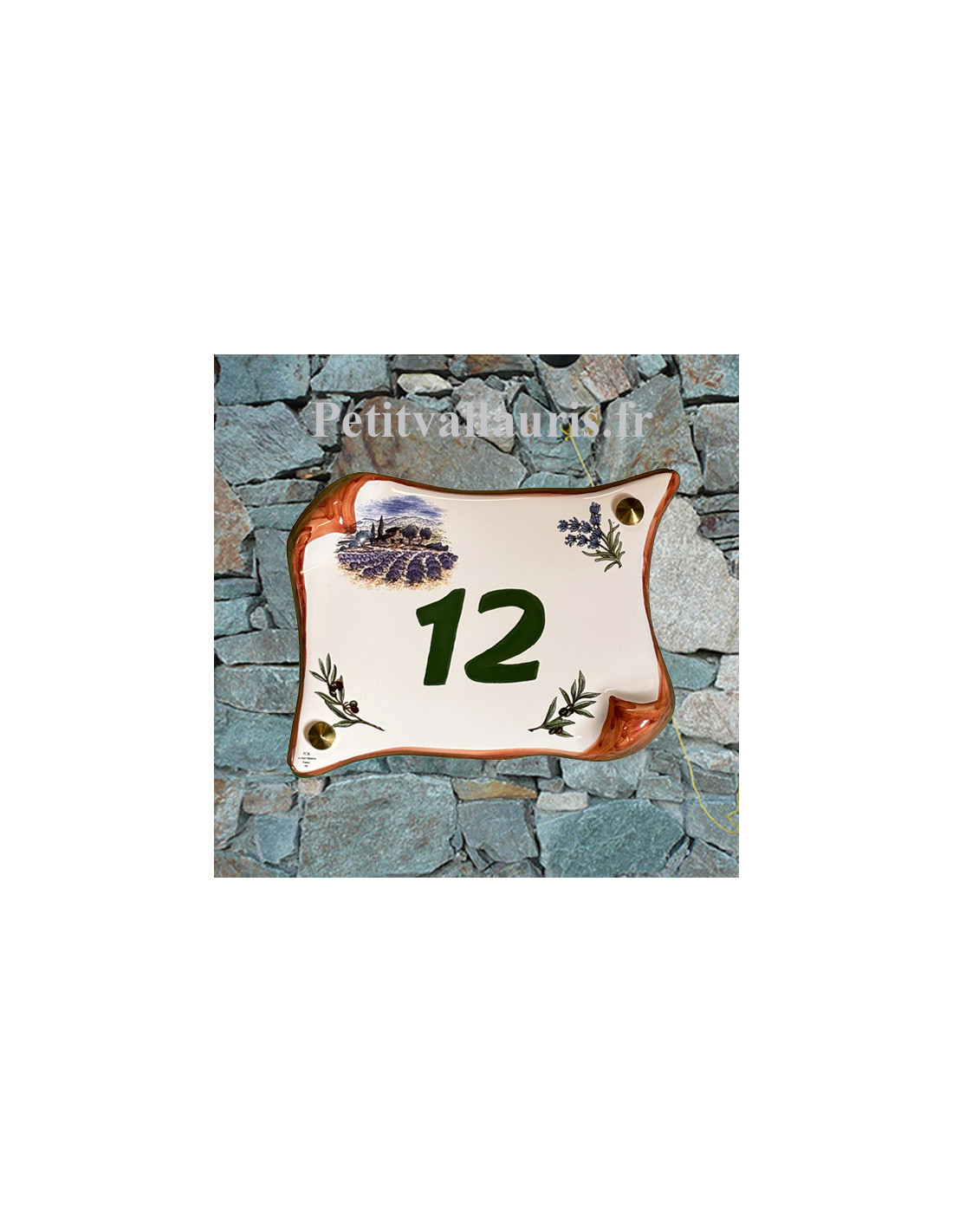 Plaque de Maison en faience modèle parchemin décor champs et brins de lavandes + olives + inscription personnalisée et bord ocre
