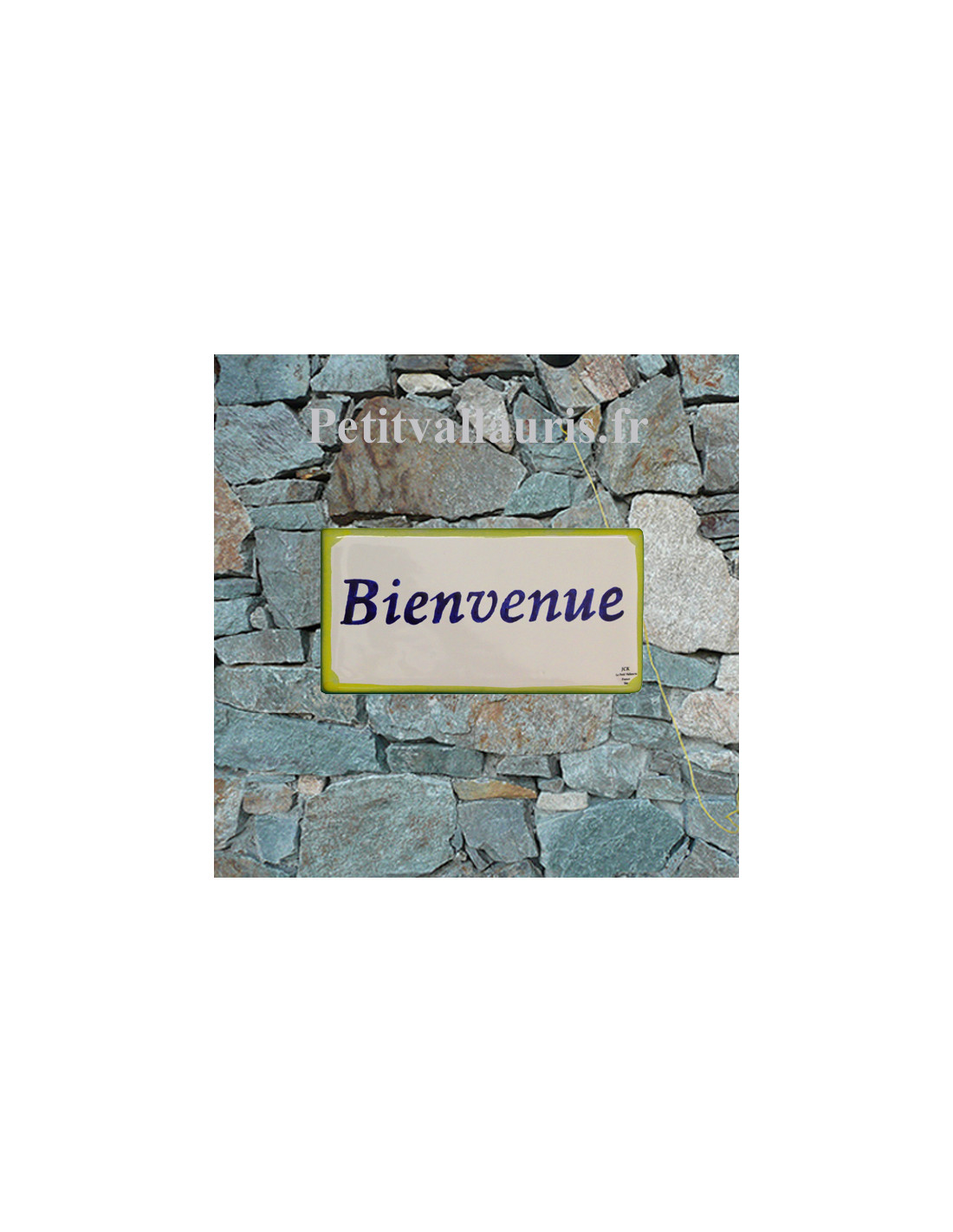 N'oubliez pas de sauvegarder votre personnalisation pour pouvoir l'ajouter au panierPlaque extérieure pour maison en céramique inscription bleue et bordure jaune.