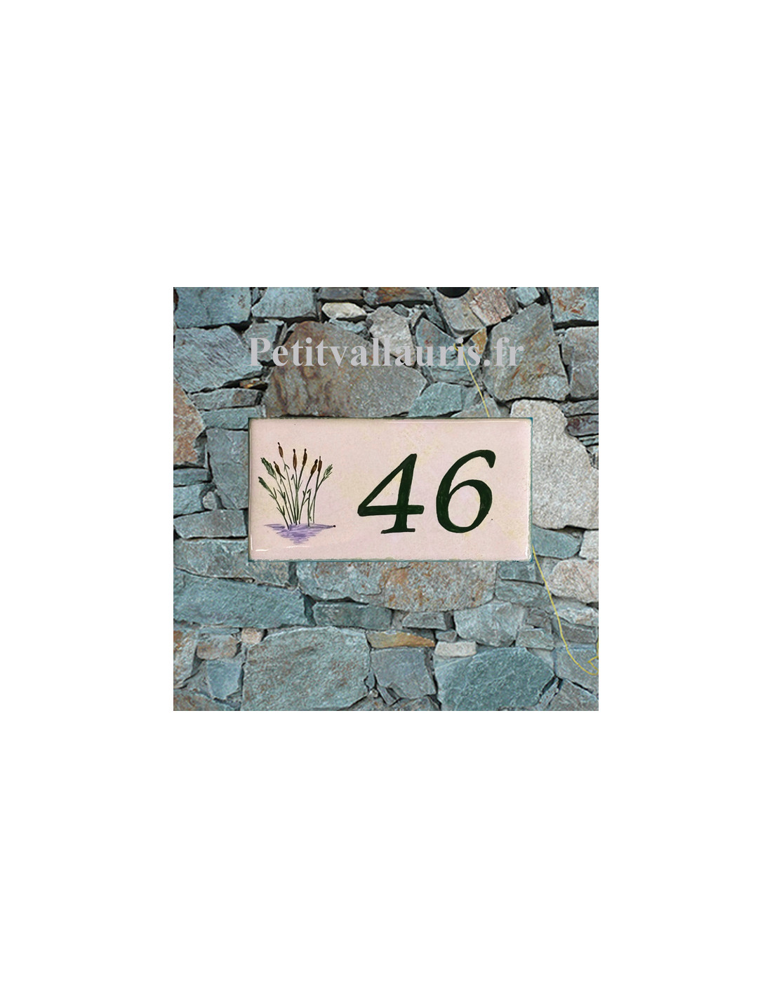Plaque chiffre de maison faïence émaillée décor les Roseaux fond blanc cassé , inscription personnalisée verte.