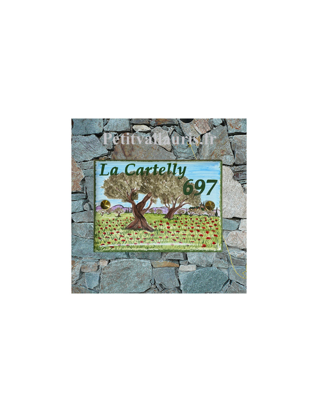 plaque pour maison céramique décor artisanal champs d'oliviers et de coquelicots + inscription couleur verte