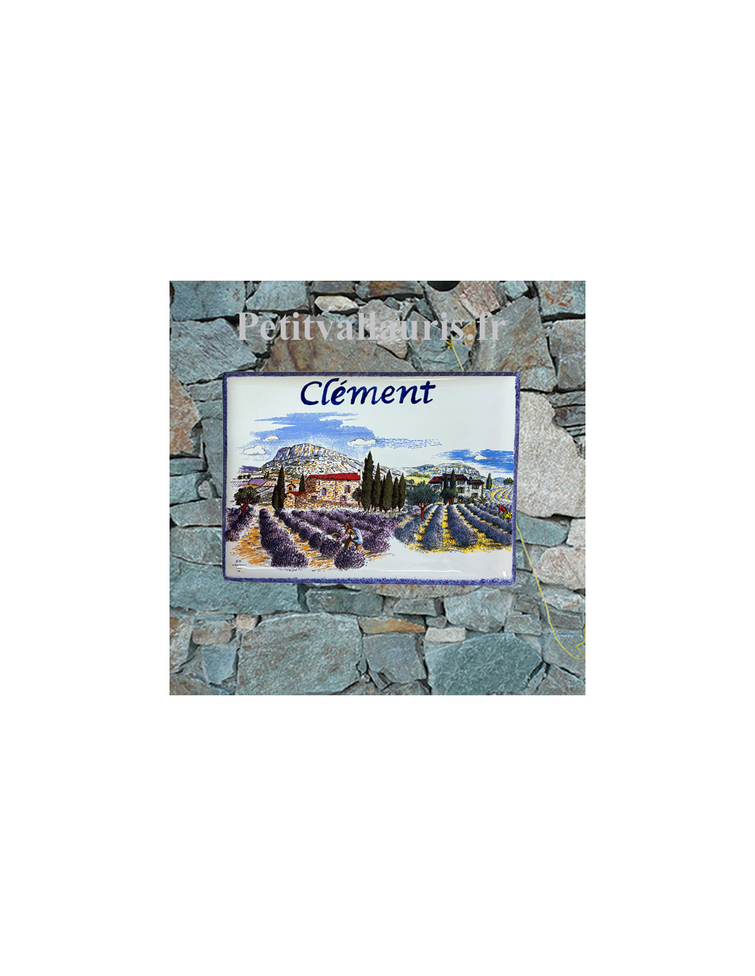 plaque décorative en céramique décor paysage champs de lavande et Garlaban, bordure et texte bleu perçage trous pour vis sur demande.