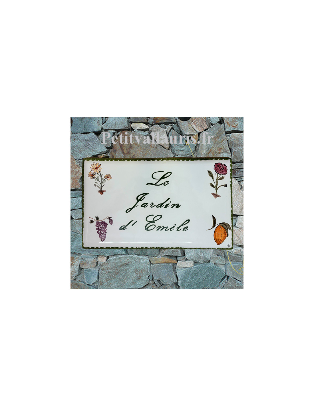 N'oubliez pas de sauvegarder votre personnalisation pour pouvoir l'ajouter au panierPlaque de maison en céramique motif fruits et fleurs d'après croquis fournit par le client sur une feuille de papier avec gravure personnalisée.