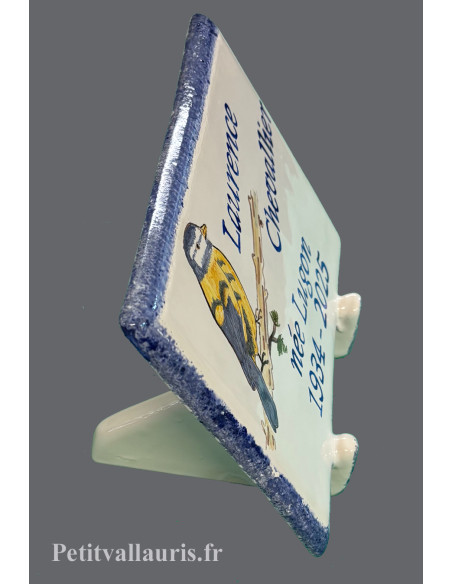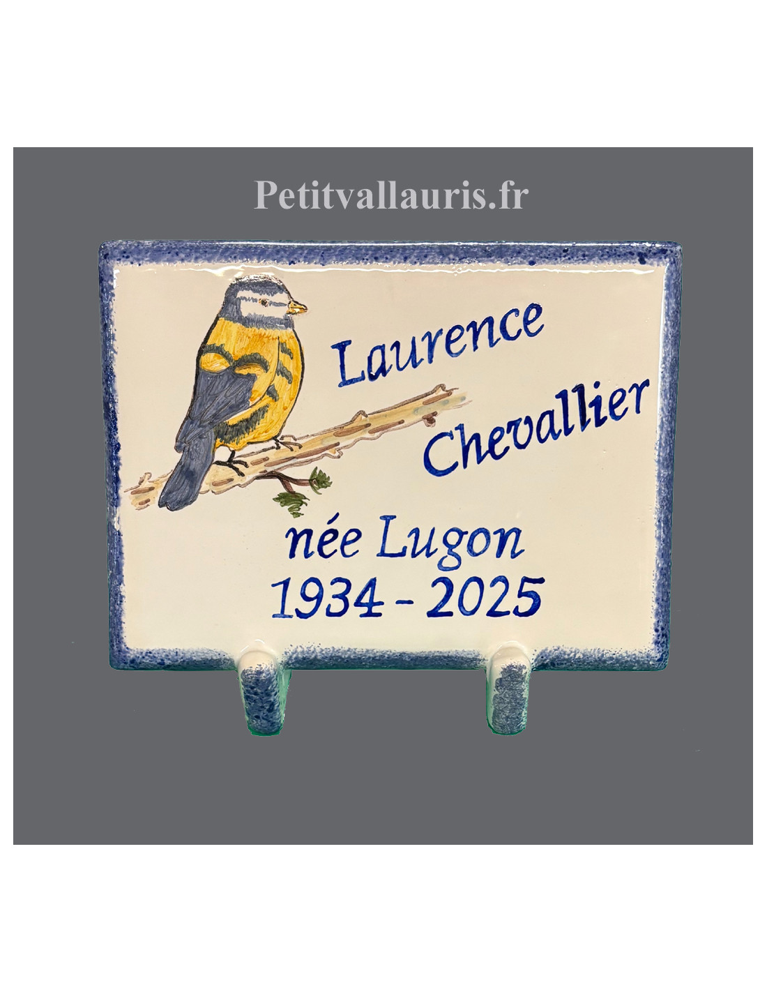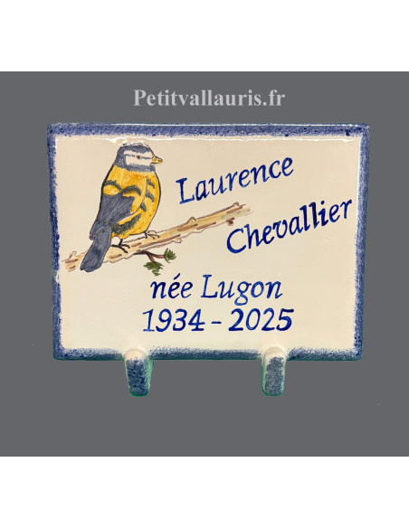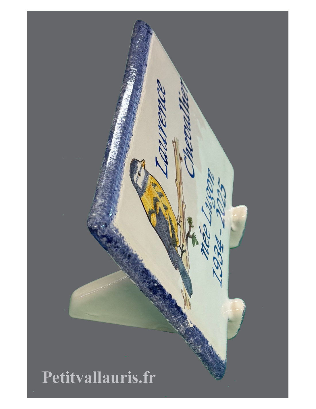 Plaque funéraire en céramique de forme rectangulaire à poser motif artisanal mésange+ personnalisation