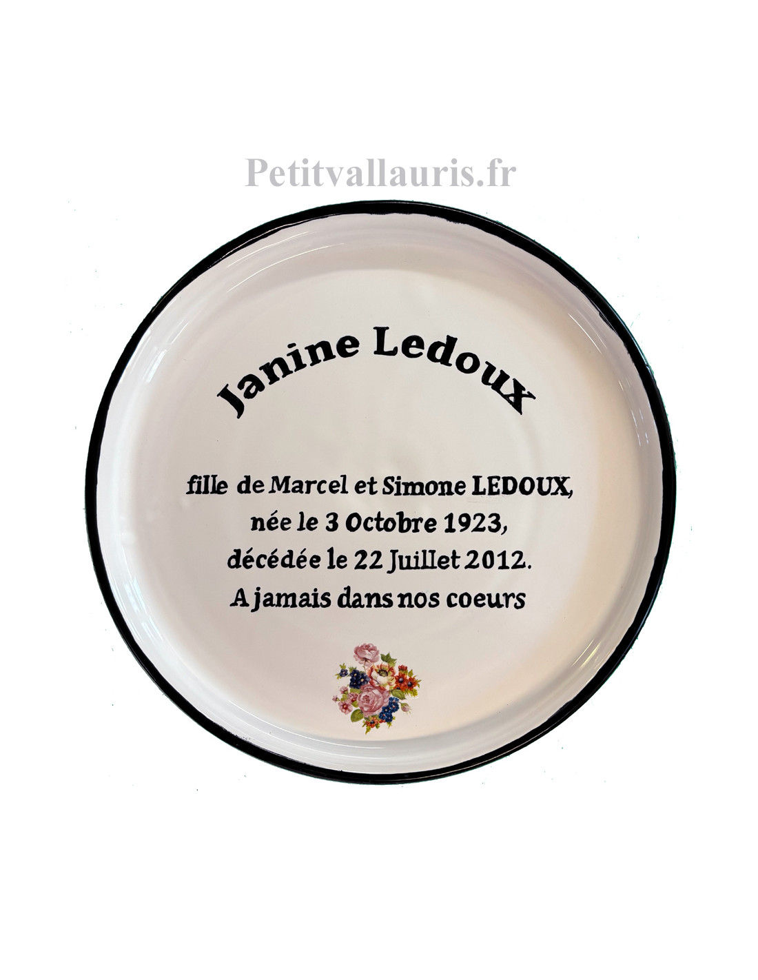 Reproduction Plaque funéraire ancienne en céramique blanche au décor bouquet fleuri avec personnalisation en noir. Plaque percée ou non percée au choix.