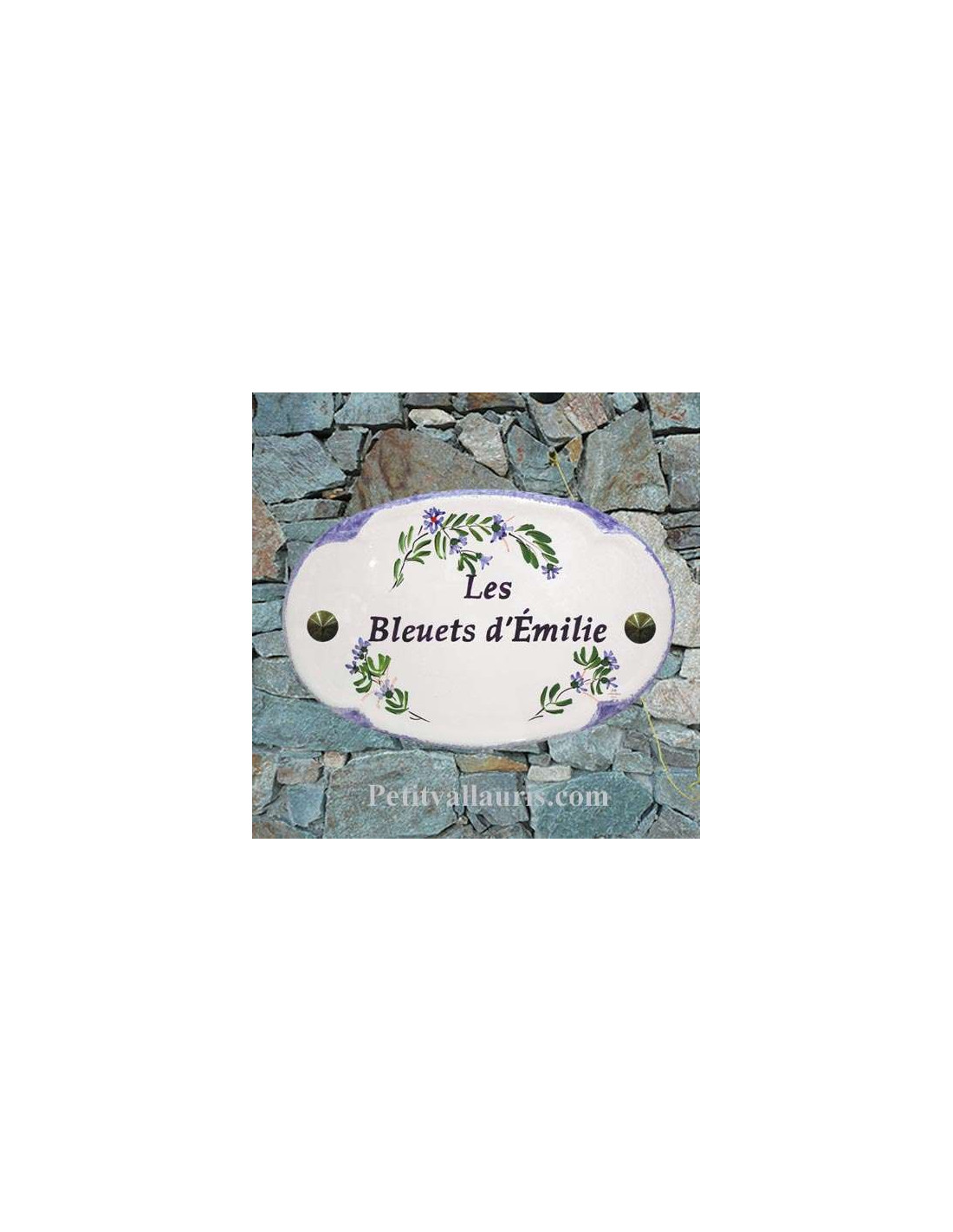 Plaque en céramique émaillée pour maison de forme ovale décor artisanal les Bleuets + personnalisation