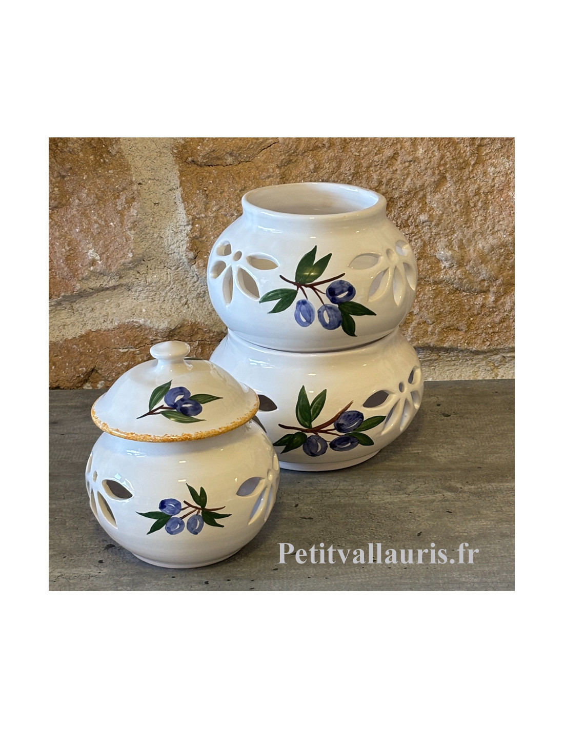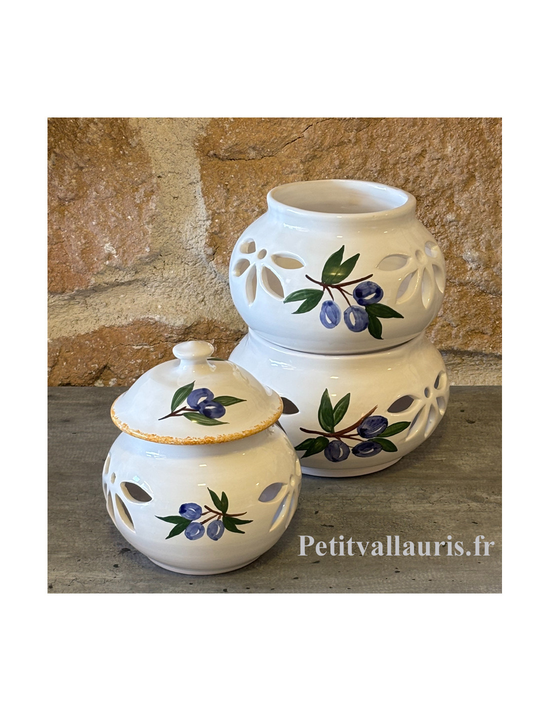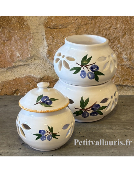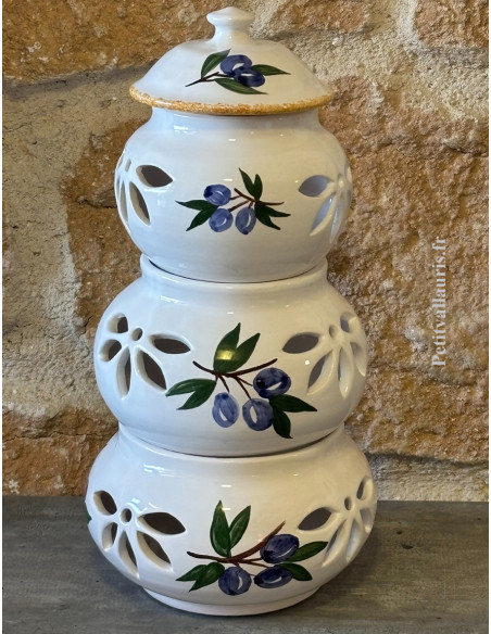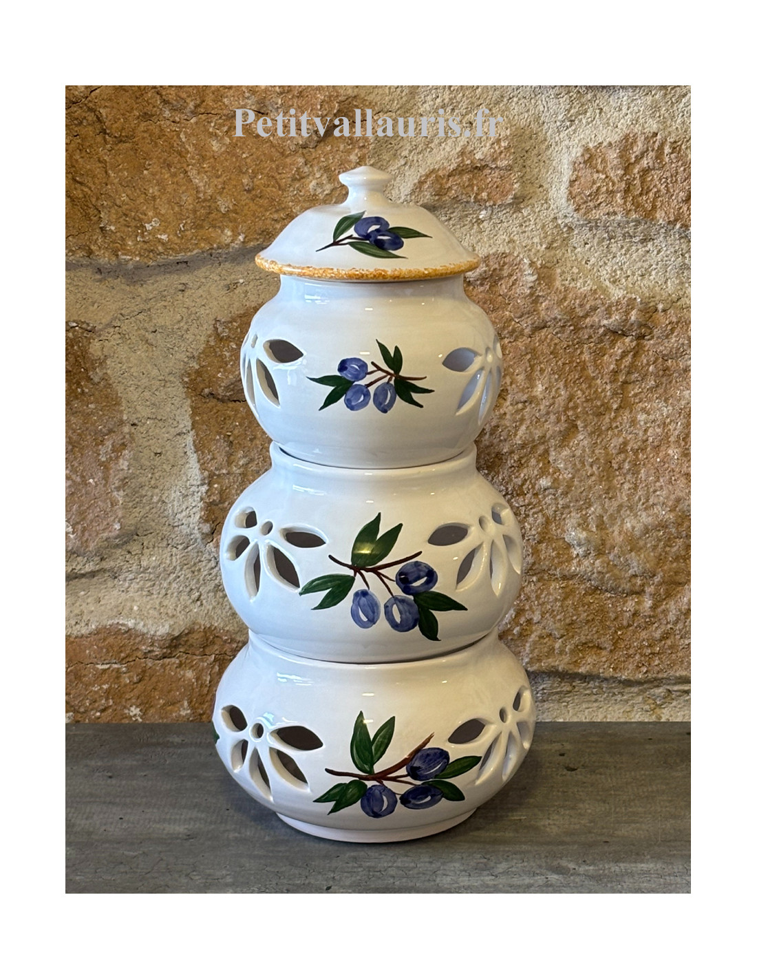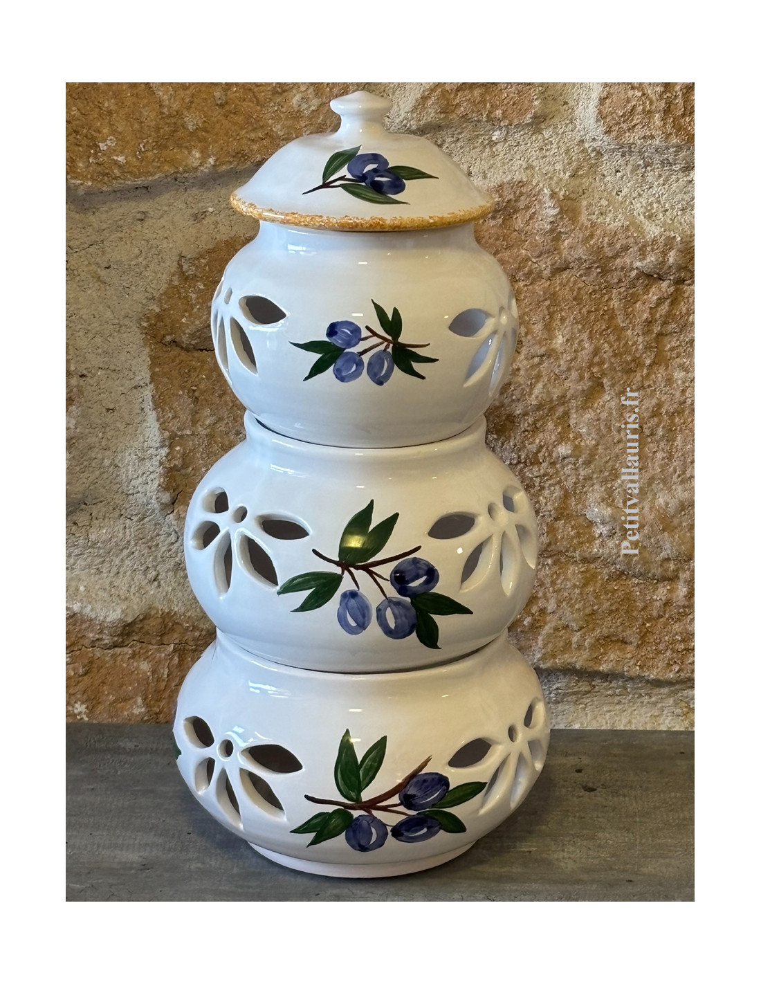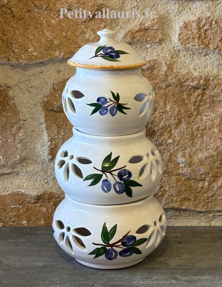 Conservateur en faience pour Ail, Oignon et Echalote 3 pots empilés motif olives bleues