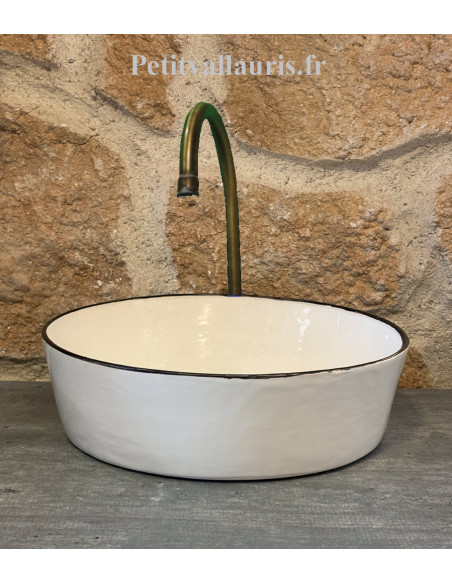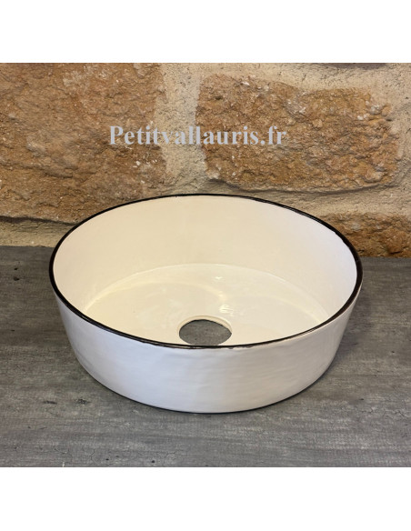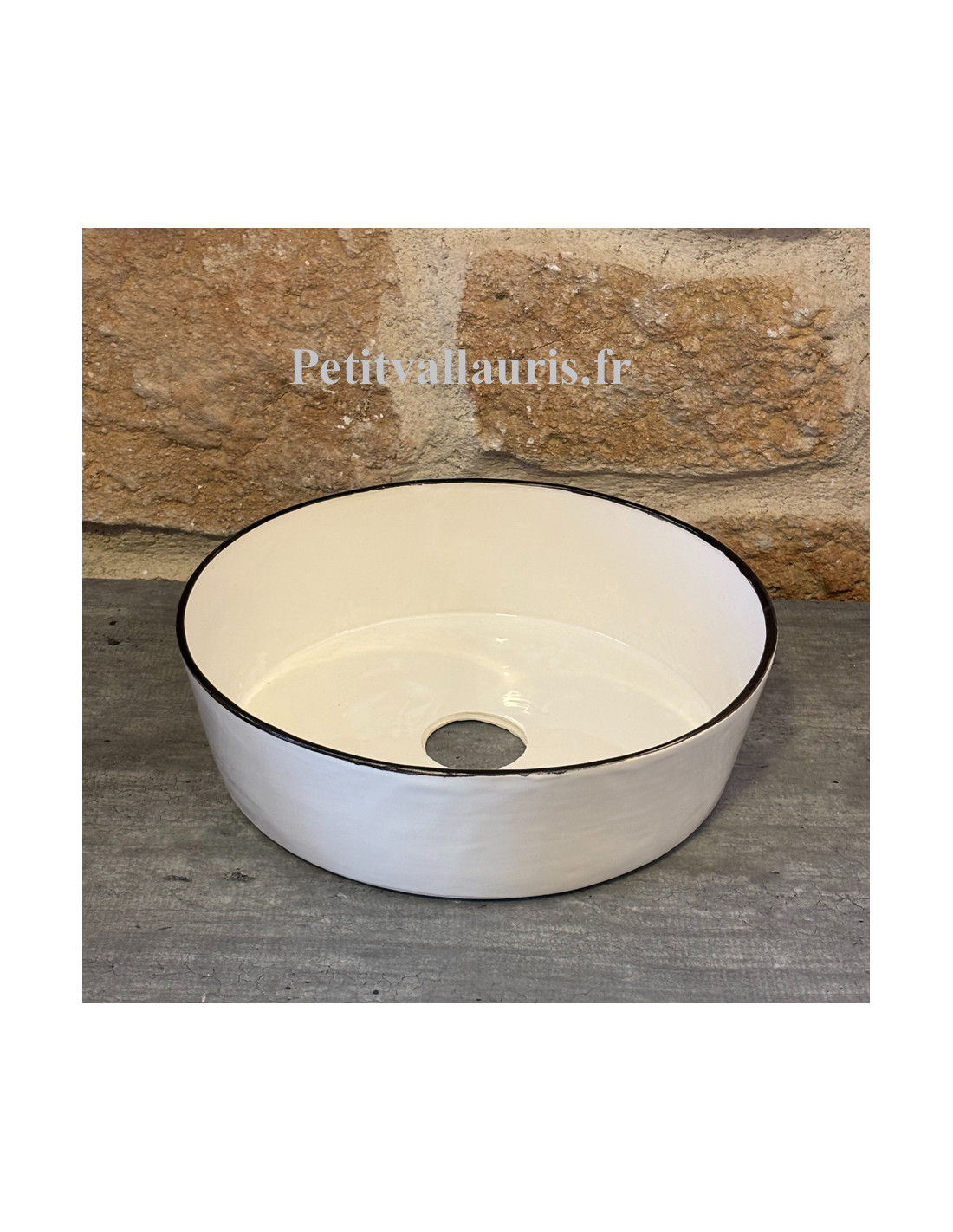 Petite Vasque ronde à poser droite en faïence pour salle de bain ou toilettes blanche avec bordure noire.